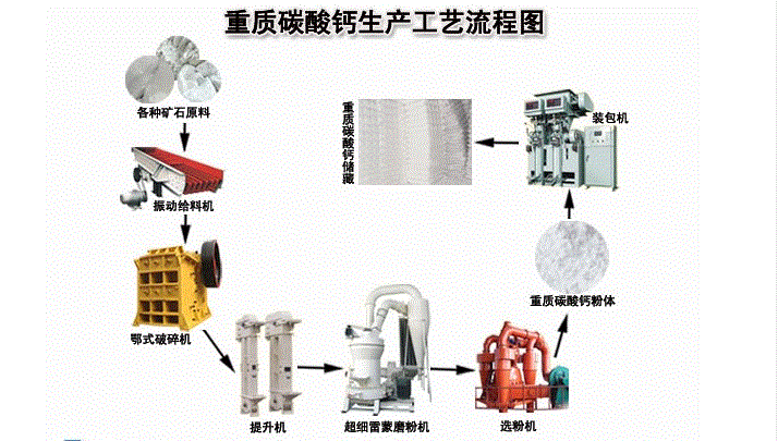 采石場(chǎng)運(yùn)來(lái)的方解石、石灰石、白堊、貝殼等,除去脈石;然后用破碎 機(jī)對(duì)石灰石等礦石進(jìn)行粗破碎,再用雷蒙磨粉機(jī)研磨得到細(xì)石灰石粉(500目以上),用分級(jí)機(jī)對(duì)粉體進(jìn)行分級(jí),符合粒度要求的粉末作為產(chǎn)品包裝入庫(kù),否 則返回磨粉機(jī)再次磨粉,直到達(dá)到選粉可以通過(guò)目數(shù)。
